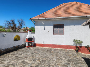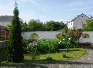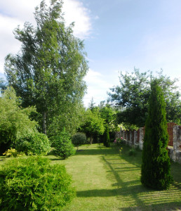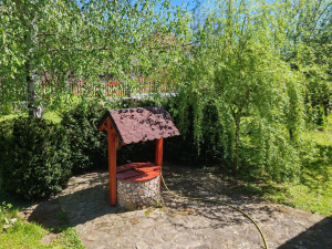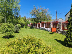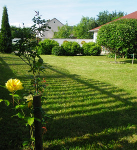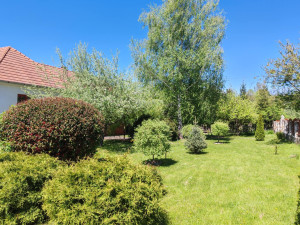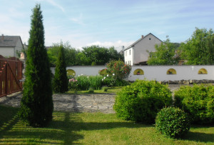 Cortile spazioso con barbecue in muratura, alberi da frutto (melo, pero, ciliegio), piante ornamentali e fiori perenni
